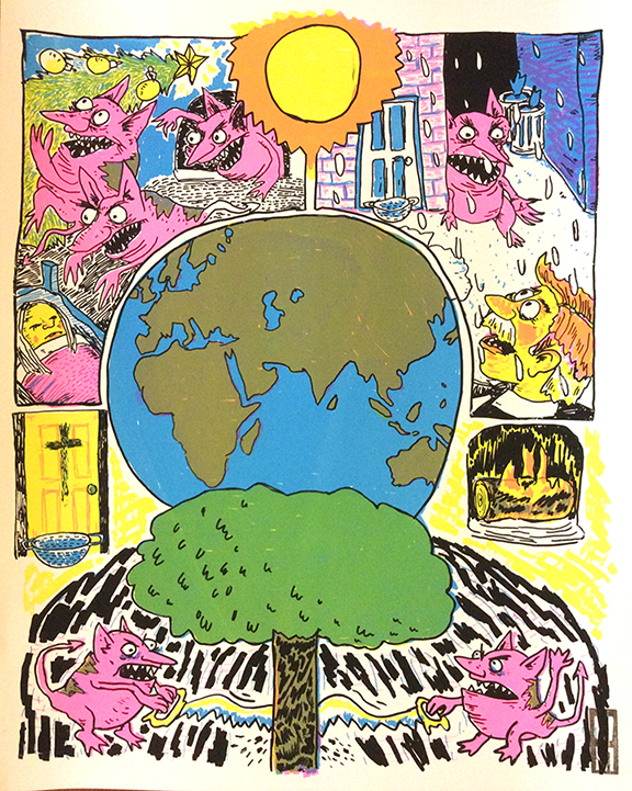 Kallikantzaros are little creatures that spend the year trying to cut down the world tree that holds up the earth. For the 12 Days of Christmas, the unbaptised days, they are able to enter our world. Four color screenprint by Walker, 19"x24"