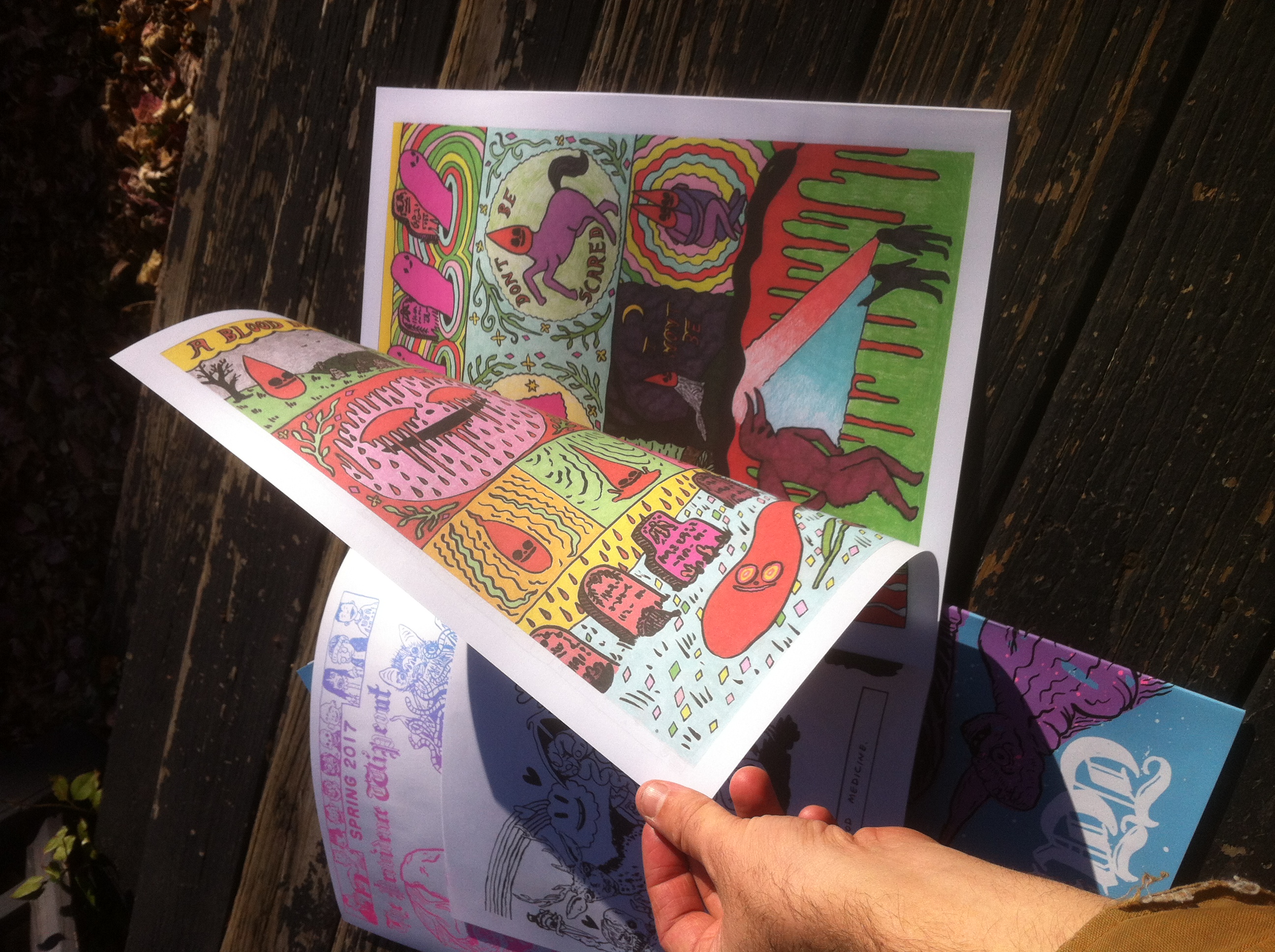 Continuing the large format Wipeout anthologies that started with oversized newspaper, this Treasury Sized zine features full color comics by Malachy Hopkins, Zachary Kemp, Caitlin Cali, Marc Pearson, Mimi Chrzanowski, Ryan Alves, Mol Pierre, Dailen Williams, Jeremy Ferris, Alison Rutsch, and Walker Mettling. Plus Risographed inserts and a screenprinted cover. 11" by 15"
