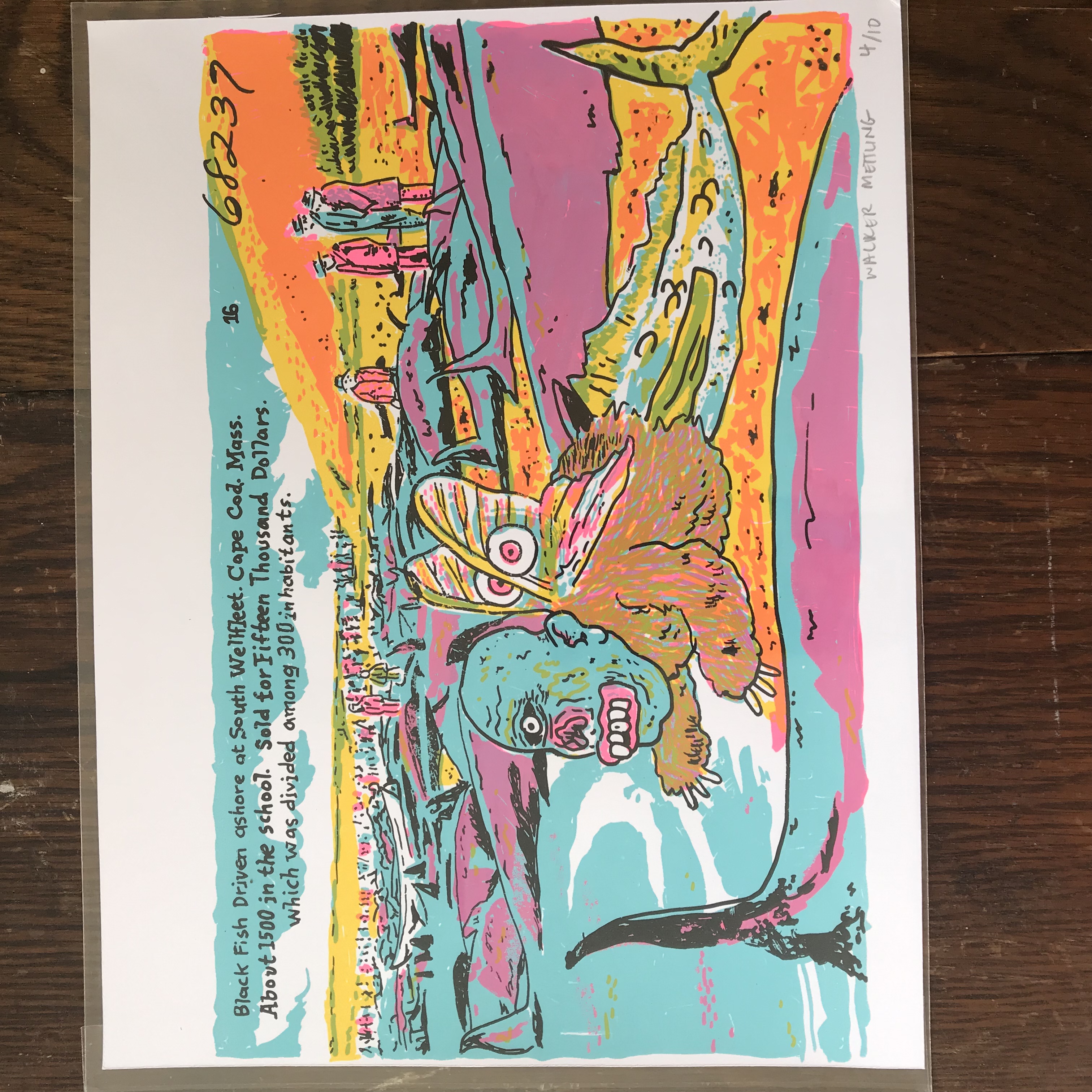 4 Layer Screenprint cover of the historical postcard captioned “Black fish driven ashore at South Wellfleet.” 8.25”wide by 11” tall. Signed & numbered. Edition of 10 for a show at Farm Projects in Wellfleet, Ma 2019.