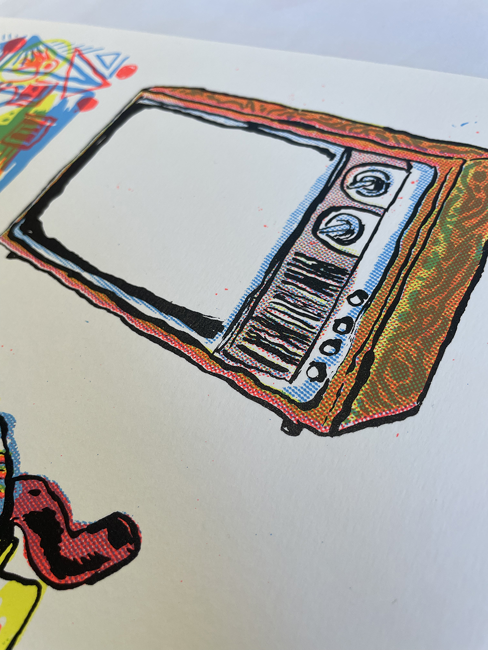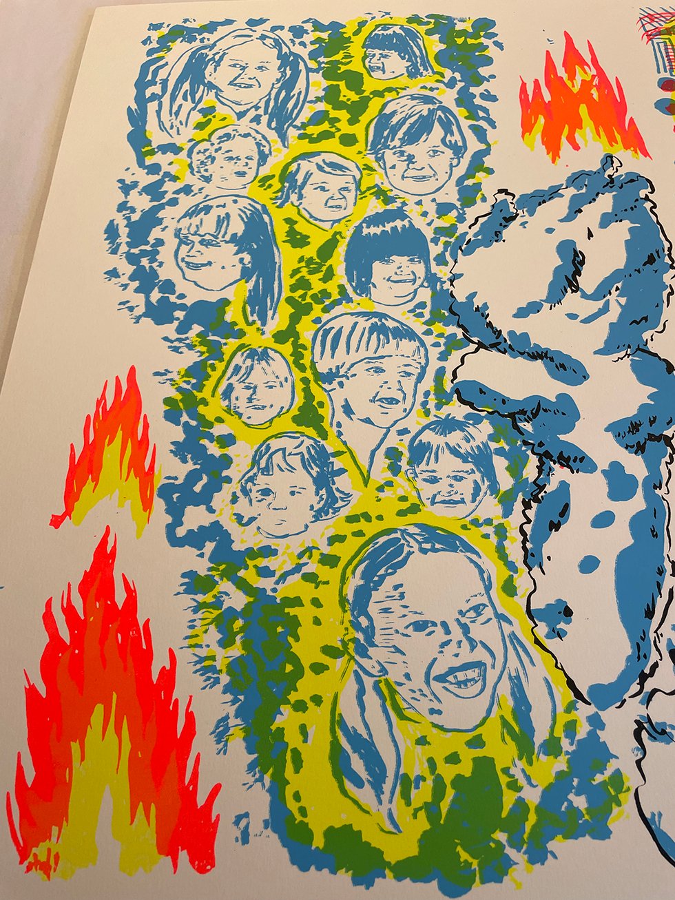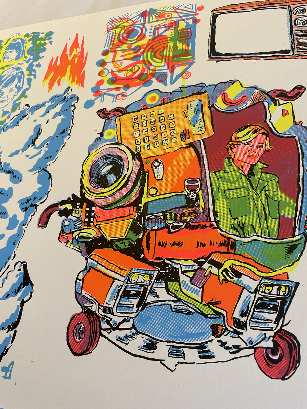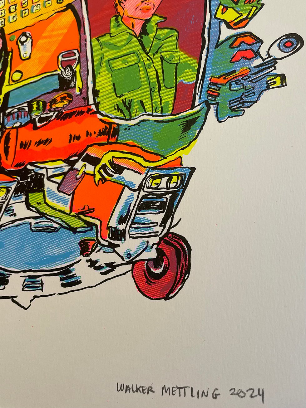Part of my 2024 Rainbow Rubble print series as stand alone prints and collage materials! The vehicle is an amalgamation of tools and machines found and referenced from the 1980 Winter Sears catalog (as are the kid's faces in the smoke!). 4 layer screenprint, hand pulled on heavy 18x24" watercolor paper. Signed, open edition. Because it's hand printed each print has minor differences--which is what makes them cool, right? Booyah!