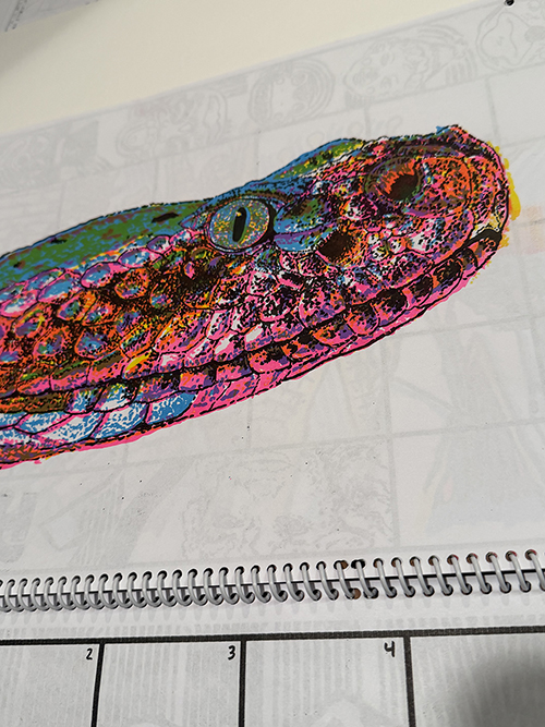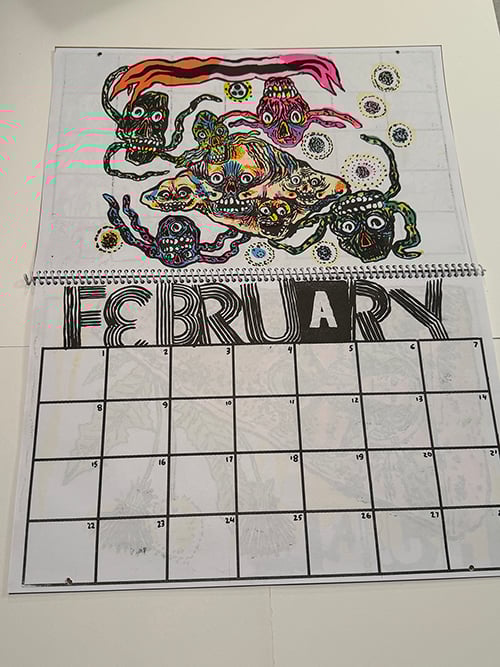 It's got extensive end notes describing the illustrations and process! Giant grids to write in all your appointments! Heavy Chipboard covers to survive a years worth of battery! I sent each book through the risograph a cumulative 51 separate color passes! Buy it! You need it! I made it with my own two primate hands.